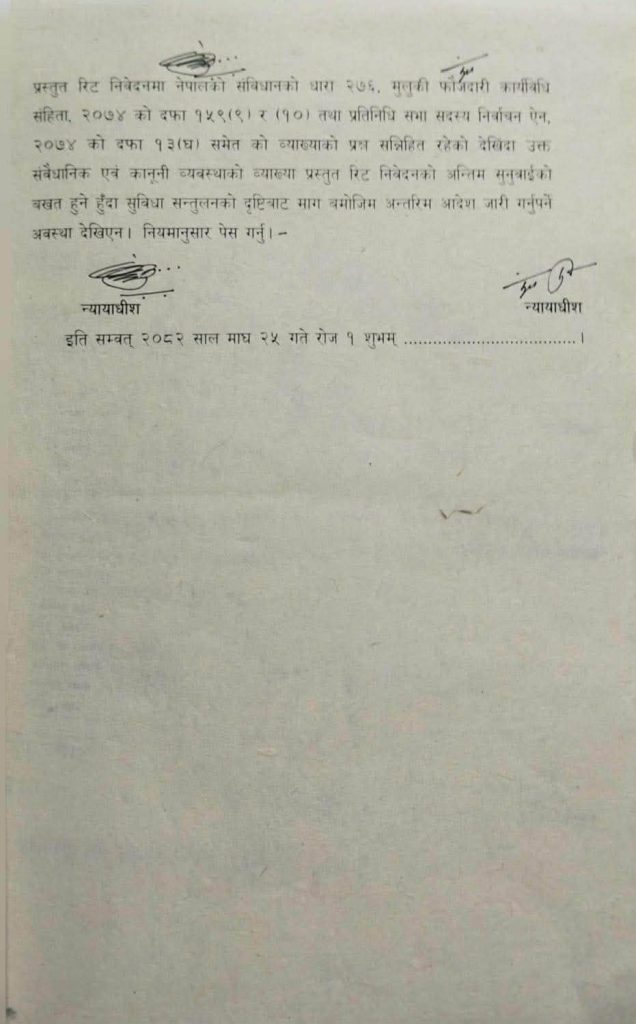 संवैधानिक तथा कानुनी व्यवस्थाको व्याख्या आवश्यक देखिएको भन्दै अदालतले तत्काल अन्तरिम आदेश जारी नगर्ने निष्कर्ष निकालेको हो । मुद्दा अब नियमित प्रक्रियाअनुसार अगाडि बढ्नेछ ।