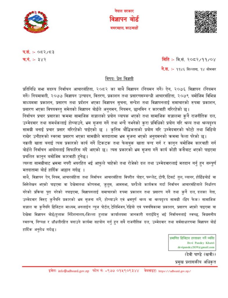 प्रतिनिधिसभा सदस्य निर्वाचन आचारसंहिता, २०८२, विज्ञापन (नियमन गर्ने) ऐन, २०७६ तथा सम्बन्धित नियमावली र आचारसंहितालाई आधार मान्दै बोर्डले प्रेस विज्ञप्ति जारी गर्दै भ्रामक, तथ्यहीन तथा द्वेषपूर्ण सामग्री प्रकाशन–प्रसारण नगर्न चेतावनी दिएको हो ।