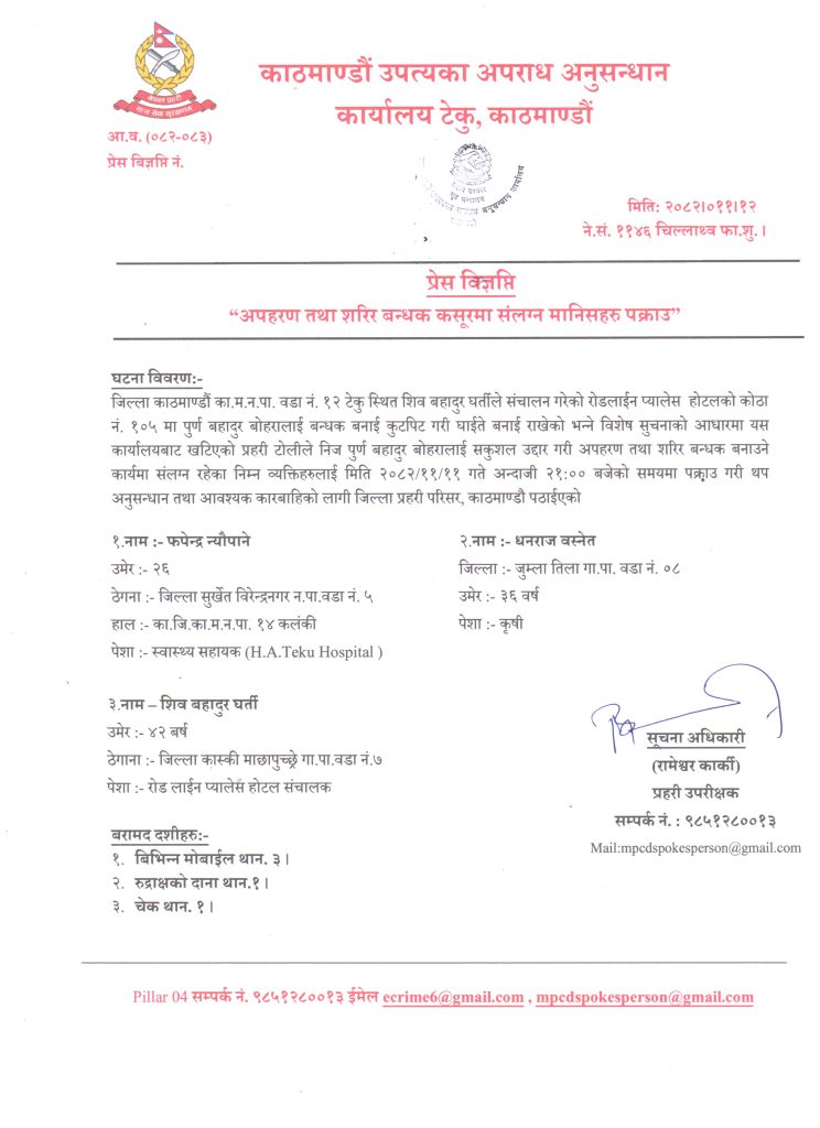 १३ फागुन २०८२‘फेक रेस्क्यू’मा संलग्न थप दुई जना पक्राउ