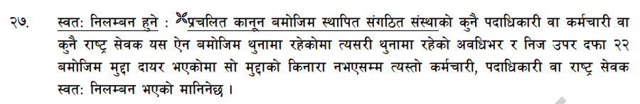 बरिष्ठ अधिवक्ता पण्डितले दफा २७ लाभको पदमा रहेका कर्मचारीलाई मात्र लाग्ने बताइरहँदा ऐनको दफा २७ मा भने ‘राष्ट्रसेवक वा पदाधिकारीहरु’ भन्ने पदावली परेको देखिन्छ ।