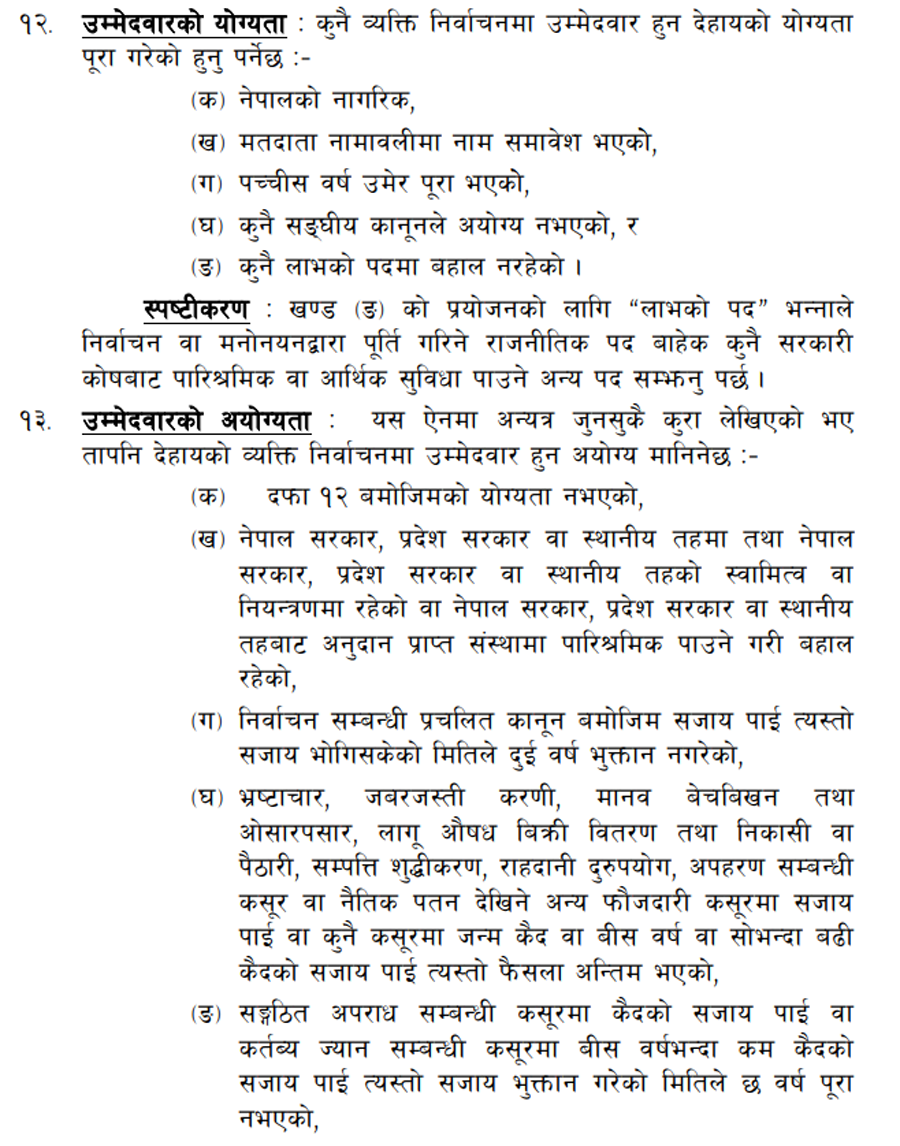 जस्तो– ऐनको दफा १३ (ग) मा ‘निर्वाचनसम्बन्धी प्रचलित कानूनबमोजिम सजाय पाई त्यस्तो सजाय भोगिसकेको मितिले दुई वर्ष भुक्तान नगरेको’ व्यक्ति हुनुपर्ने भनिएको छ ।