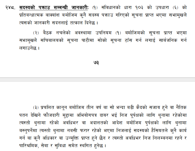 त्यस्तै उपदफा (घ) मा सांसदको अयोग्यताबारे स्पष्ट पार्दै भनिएको छ, ‘भ्रष्टाचार, जबरजस्ती करणी, मानव बेचविखन तथा ओसारपसार, लागू औषध बिक्री वितरण तथा निकासी वा पैठारी, सम्पत्ति शुद्धीकरण, राहदानी दुरुपयोग, अपहरण सम्बन्धी कसूर वा नैतिक पतन देखिने अन्य फौजदारी कसूरमा सजाय पाई वा कुनै कसूरमा जन्म कैद वा बीस वर्ष वा सोभन्दा बढी कैदको सजाय पाई त्यस्तो फैसला अन्तिम भएको ।’