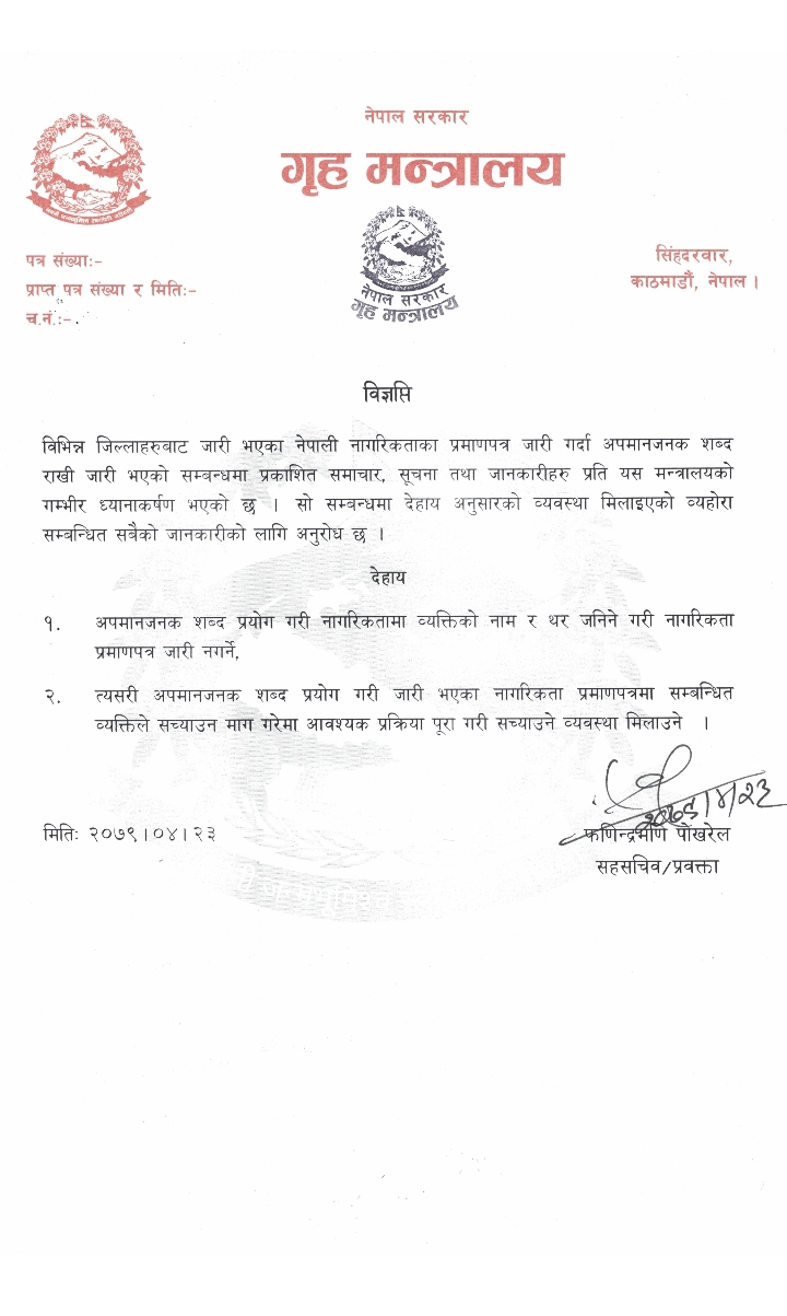 मन्त्रालयका सहसचिव तथा प्रवक्ता फणिन्द्रमणि पोख्रेलद्वारा जारी विज्ञप्तिमा नागरिकतामा व्यक्तिको नाम वा थर जनाउँदा अपमानजनक शब्द प्रयोग नगर्न र यदि त्यस्तो भएको छ भने सम्बन्धित व्यक्तिको माग अनुसार आवश्यक प्रक्रिया पूरा गरी सच्याइदिन जिल्ला प्रशासन कार्यालयहरूलाई व्यवस्था मिलाउन आग्रह गरिएको थियो ।