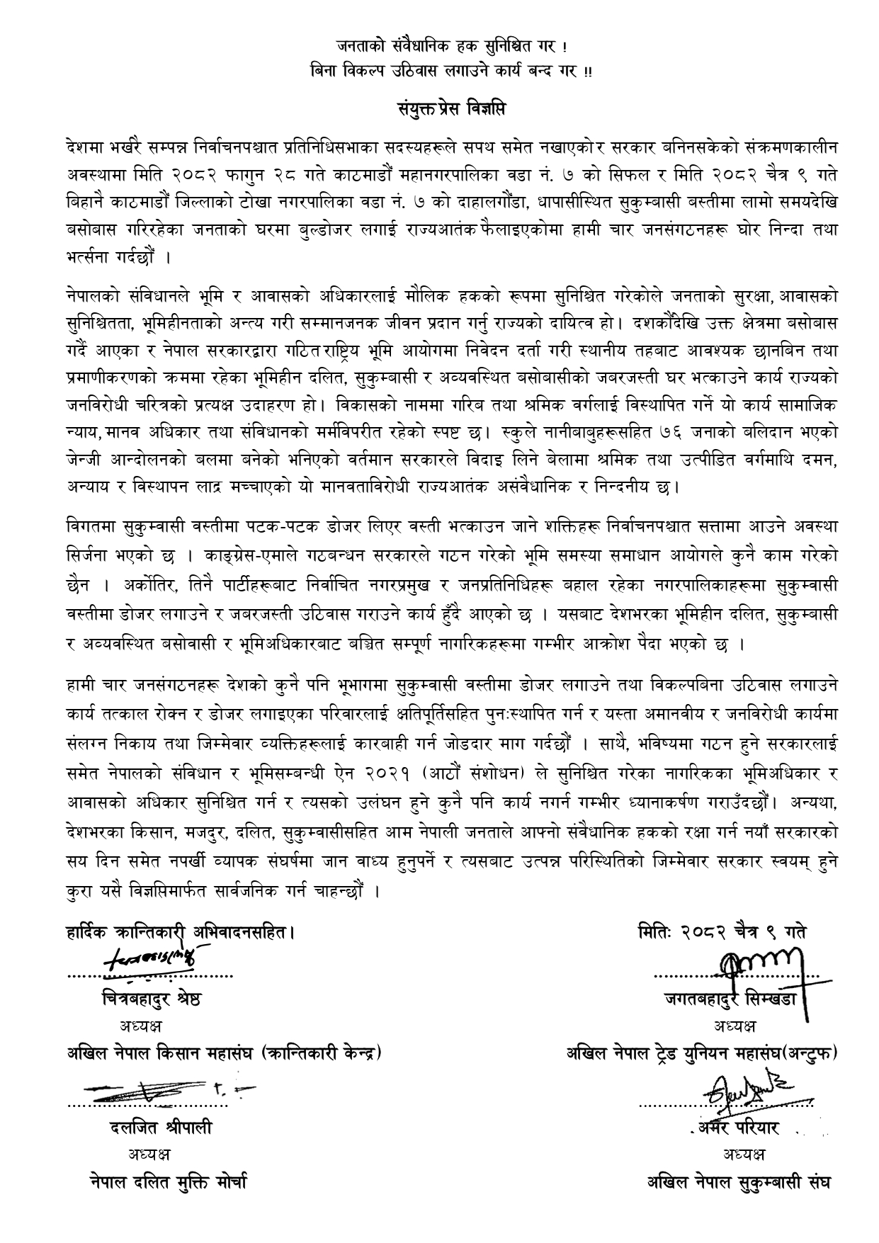 दशकौँदेखि उक्त क्षेत्रमा बसोबास गर्दै आएका र नेपाल सरकारद्वारा गठित राष्ट्रिय भूमि आयोगमा निवेदन दर्ता गरी स्थानीय तहबाट आवश्यक छानबिन तथा प्रमाणीकरणको क्रममा रहेका भूमिहीन दलित, सुकुम्बासी र अव्यवस्थित बसोबासीको जबरजस्ती घर भत्काउने कार्य राज्यको जनविरोधी चरित्रको प्रत्यक्ष उदाहरण भएको विज्ञप्तिमा दाबी गरिएको छ ।