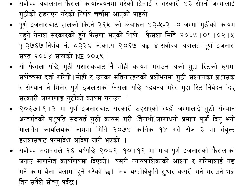 सर्वोच्च अदालतले १६ वर्षपछि २०८२/१०/१२ मा मात्र पूर्ण इजलासको फैसलाको जनाउ मालपोत कार्यालयमा दिएको । यसरी न्यायपालिकाको आस्था र गरिमालाई नष्ट गर्ने काम बेला–बेलामा हुने गरेको छ । अब यस्तो विकृति सुधार कसरी गर्ने गराउने भन्नेतिर सबैले सोच्नु पर्दछ ।