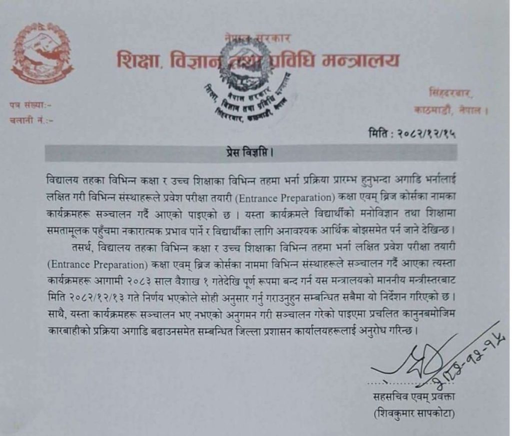 काठमाडौँ । सरकारले आगामी बैशाख १ देखि ‘ब्रिज कोर्स’ तथा उच्च शिक्षाका प्रवेश परीक्षाका तयारी कक्षाहरू सञ्चालनमा प्रतिबन्ध लगाउने सूचना जारी भएपछि विद्यार्थीहरुमा अन्योल देखियो । सरकारी सूचनाले विद्यार्थी अल्मलिएपछि शिक्षा मन्त्रालयले जारी गरेको सूचनासमेत वेबसाइटबाट हटाइयो ।