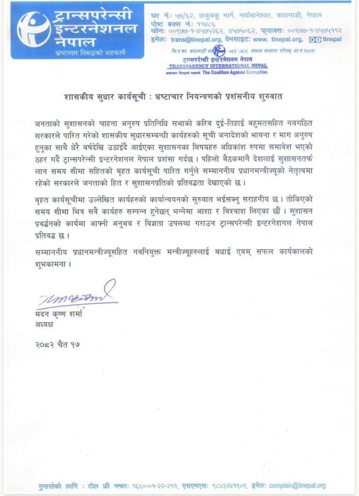 ट्रान्सपरेन्सी इन्टरनेसनल नेपालले मंगलबार एक विज्ञप्ति जारी गर्दै शासकीय सुधारसम्बन्धी कार्यहरूको सूची जनादेशको भावना र मागअनुरूप हुनाका साथै धेरै वर्षदेखि उठाइँदै आइएका सुशासनका विषयहरू अधिकांश रूपमा समावेश भएको ठहर गरेको छ ।
