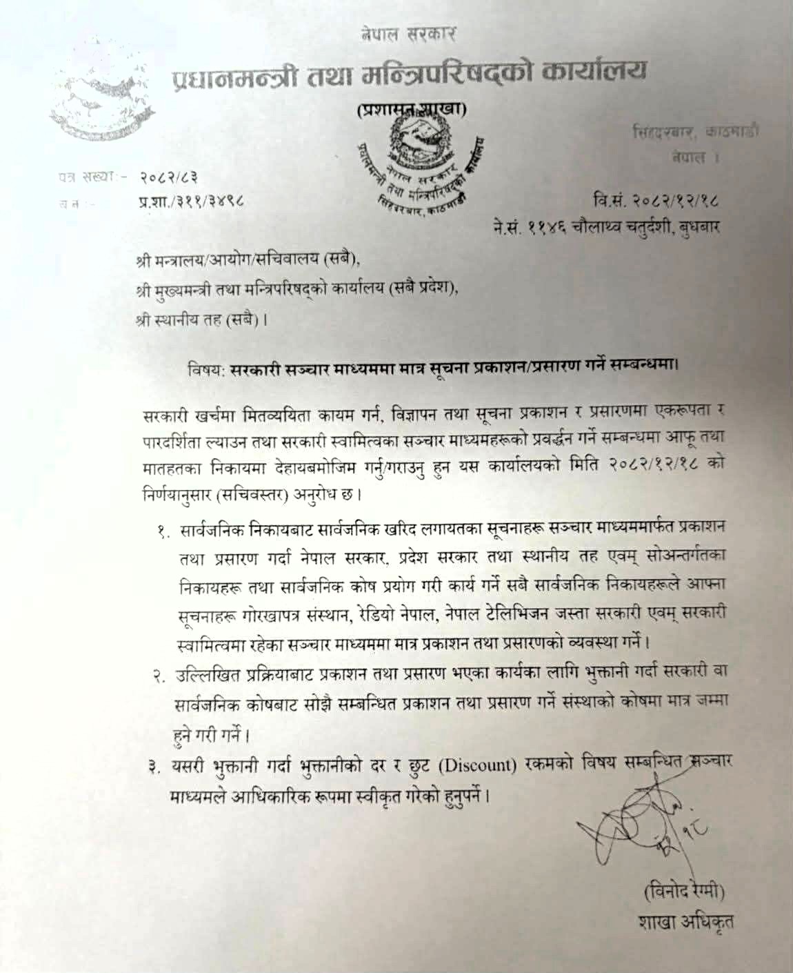 प्रधानमन्त्री तथा मन्त्रिपरिषद्‌को कार्यालयले हिजो (बुधबार) जारी गरेको पत्राचारमा नेपाल सरकार, प्रदेश सरकार तथा स्थानीय तह एवम्‌ सो अन्तर्गतका निकायहरूलाई विज्ञापन तथा सूचना प्रकाशन/प्रसारण गर्दा सरकारी वा सार्वजनिक कोषबाट सोझै सम्बन्धित प्रकाशन तथा प्रसारण गर्ने संस्थाको कोषमा मात्रै जम्मा हुनेगरी गर्न भनेको छ । साथै; त्यसरी भुक्तानी गर्दा भुक्तानीको दर र छुट रकमको विषय सम्बन्धित सञ्चार माध्यमले आधिकारिक रूपमा स्वीकृत गरेको हुनुपर्ने उल्लेख छ ।