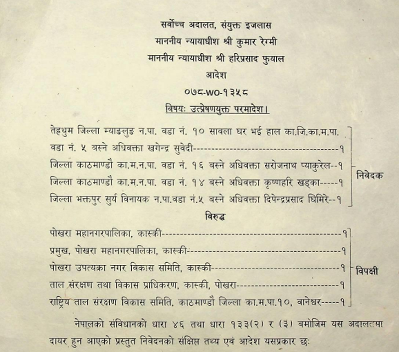 १३. अब, निरुपण गर्नुपर्ने पहिलो प्रश्नतर्फ विवेचना गर्दा, फेवातालको संरक्षणको सम्बन्धमा यस अदालतले मिति २०७५।०१।१६ मा ५ वटा रिट निवेदन (०६७-wo-०६९४, ०६८-८०-०८२, ०६९-७०-२९४,०७१-८०-१०३४,०७२-७०-०१२७) माथि अन्तिम सुनुवाई गरी निर्णय सुनाउँदा महत्वपूर्ण आदेशहरू जारी गरेको पाइन्छ। उक्त आदेशहरूमा यस अदालतले फेवातालको महत्त्व माथिसमेत विशेष चर्चा गरी फेवातालको संरक्षण र संवर्धनको लागि देहाय बमोजिम उत्प्रेषणयुक्त परमादेश लगायतको आदेश जारी गरेको पाइयो ।