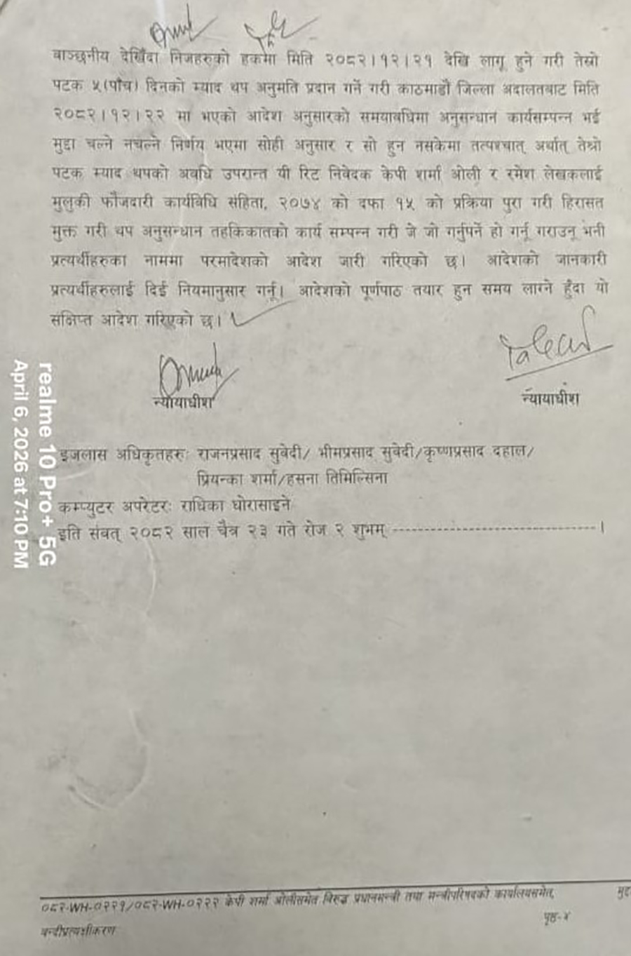 १. निजहरुको हकमा मिति २०८२।१२।२१ देखि लागू हुने गरी तेस्रो पटक ५ (पाँच) दिनको म्याद थप अनुमति प्रदान गर्ने गरी काठमाडौं जिल्ला अदालतबाट मिति २०८२।१२।२२ मा भएको आदेश अनुसारको समयावधिमा अनुसन्धान कार्यसम्पन्न भई मुद्दा चल्ने नचल्ने निर्णय भएमा सोही अनुसार गर्नू ।