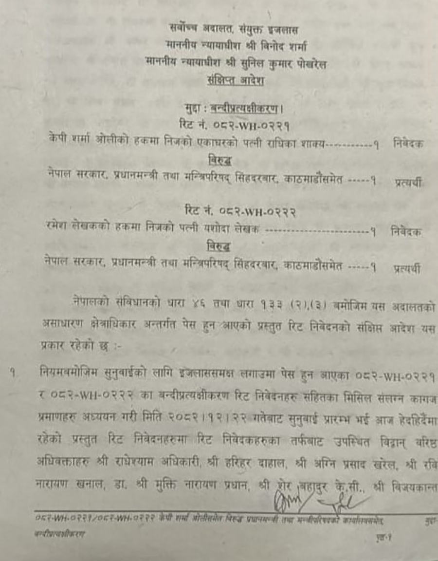 ओली र लेखक पक्राउ परेपछि राधिका शाक्य र यशोदा लेखकले सर्वोच्च अदालतमा बन्दी प्रत्यक्षीकरणका बेग्लाबेग्लै रिट दायर गरेका थिए । ती रिटहरुलाई एकै ठाउँमा लगाऊमा राखेर सुनुवाई गर्दै सर्वोच्च अदालतले सोमबार फैसला सुनाएको हो ।