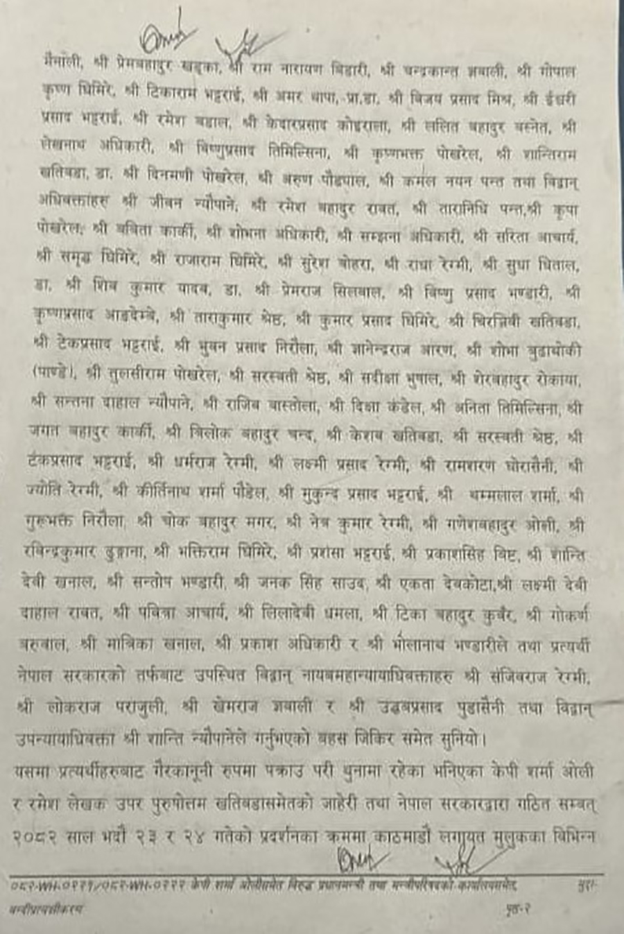 २. सो हुन नसकेमा तत्पश्चात् अर्थात् तेश्रो पटक म्याद थपको अवधि उपरान्त यी रिट निवेदक केपी शर्मा ओली र रमेश लेखकलाई मुलुकी फौजदारी कार्यविधि संहिता, २०७४ को दफा १५ को प्रक्रिया पूरा गरी हिरासत मुक्त गरी थप अनुसन्धान तहकिकातको कार्य सम्पन्न गरी जे जो गर्नुपर्ने हो, गर्नु गराउनू ।