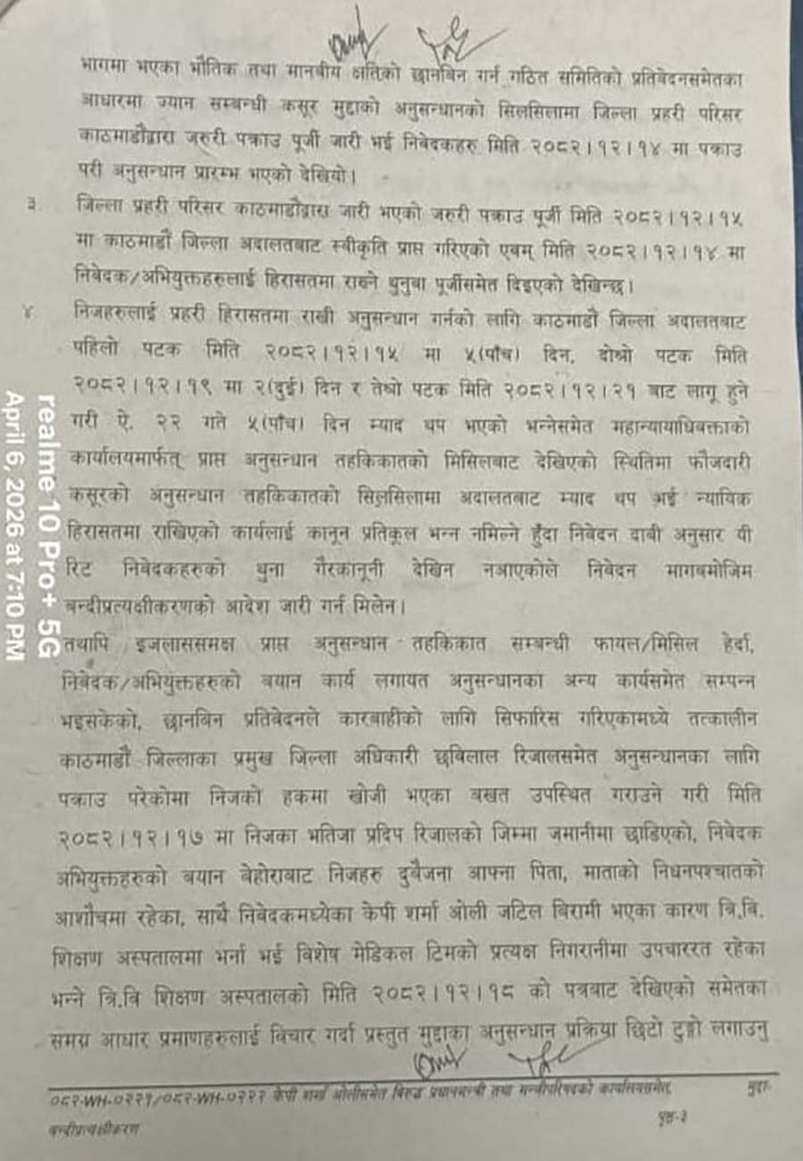 निजहरुलाई प्रहरी हिरासतमा राखी अनुसन्धान गर्नको लागि काठमाडौँ जिल्ला अदालतबाट पहिलो पटक मिति २०८२।१२।१५ मा ५ (पाँच) दिन, दोश्रो पटक मिति २०८२।१२।१९ मा २ (दुई) दिन र तेश्रो पटक मिति २०८२।१२।२१ बाट लागू हुने गरी ऐ. २२ गते ५ (पाँच) दिन म्याद थप भएको भन्नेसमेत महान्यायाधिवक्ताको कार्यालयमार्फत् प्राप्त अनुसन्धान तहकिकातको मिसिलबाट देखिएको स्थितिमा फौजदारी कसूरको अनुसन्धान तहकिकातको सिलसिलामा अदालतबाट म्याद थप अई न्यायिक हिरासतमा राखिएको कार्यलाई कानून प्रतिकूल भन्न नमिल्ने हुँदा निवेदन दाबी अनुसार यी रिट निवेदकहरुको थुना गैरकानूनी देखिन नआएकाले निवेदन मागबमोजिम बन्दीप्रत्यक्षीकरणको आदेश जारी गर्न मिलेन।
