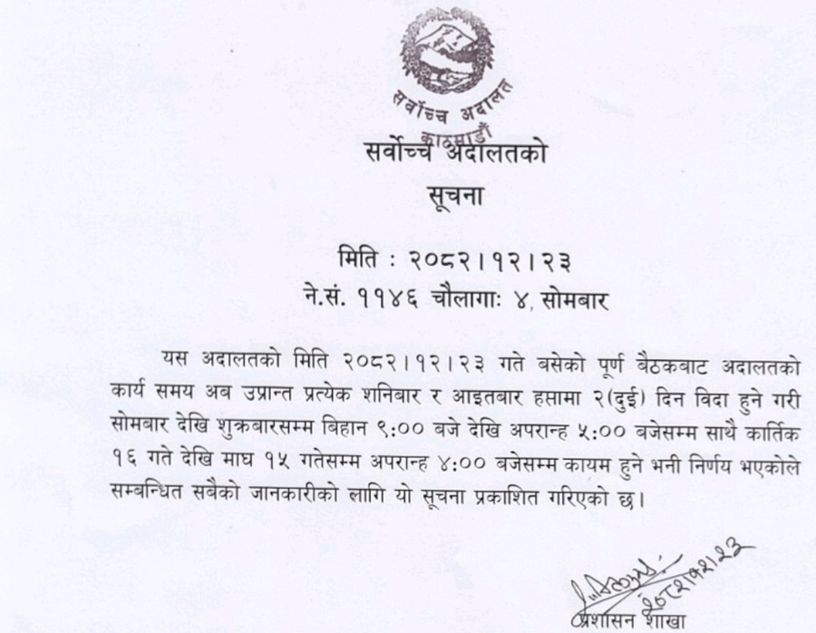 सरकारले तोकेको दुईदिने सार्वजनिक विदा र सर्वोच्च अदालतको पूर्ण बैठकले तोकेको विदाको समायोजन गर्ने र अदालतको कार्यसमयका अतिरिक्त अदालत बन्द रहने दिनमा कसरी काम गर्ने भन्ने विषयमा जिम्मेवारी तोक्ने अधिकार प्रधानन्यायाधीशलाई दिइएको छ ।