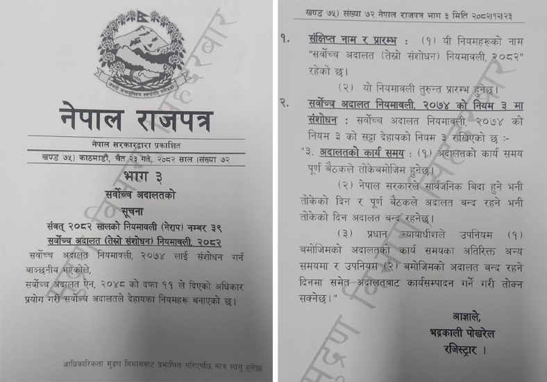 सोमबार राजपत्रमा प्रकाशित संशोधित नियमावलीले अदालत बन्द रहने दिनको जिम्मेवारी तोक्ने अधिकार प्रधानन्यायाधीलाई दिएको हो।