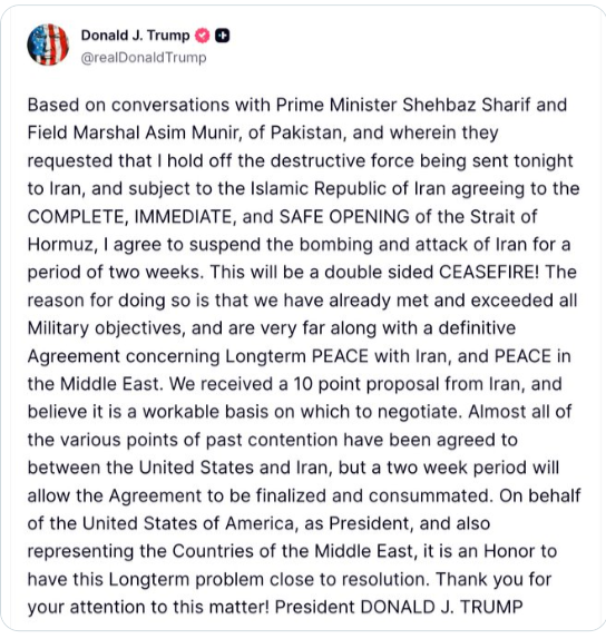 मंगलबार साँझ, योजनाबद्ध आक्रमणको चेतावनी दिएको केही घण्टाभित्र ट्रम्पले आफ्नो प्लेटफर्म ट्रुथ सोसियलमा ‘दुईतर्फी यद्धविराम’ हुने बताए।