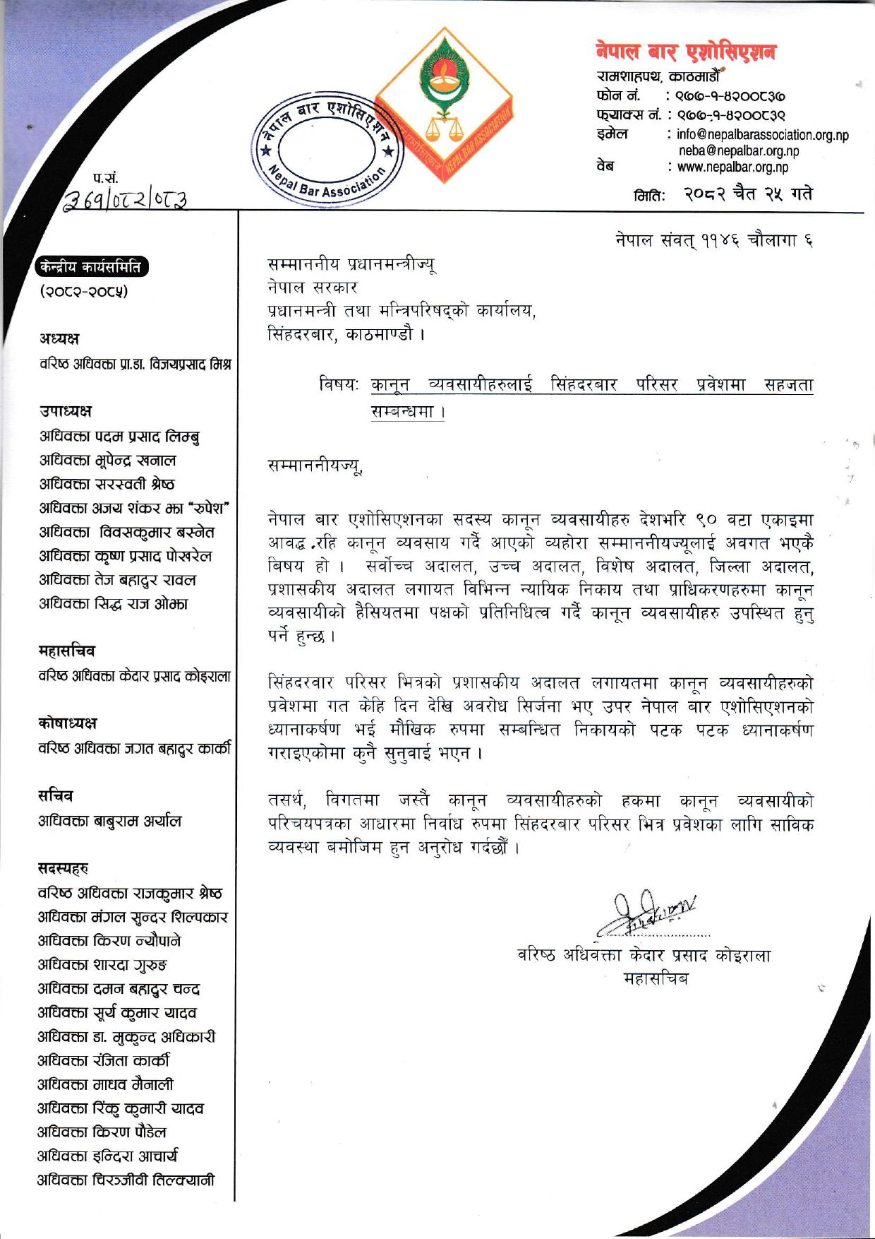 यसैवीच, नेपाल बार एशोसिएसनले सरकारको निर्णयप्रति आपत्ति जनाउँदै पहिलेकै जसरी परितयपत्रका आधारमा वकीलहरुलाई सि‌हदरबारमा प्रवेश दिन माग गरेको छ ।