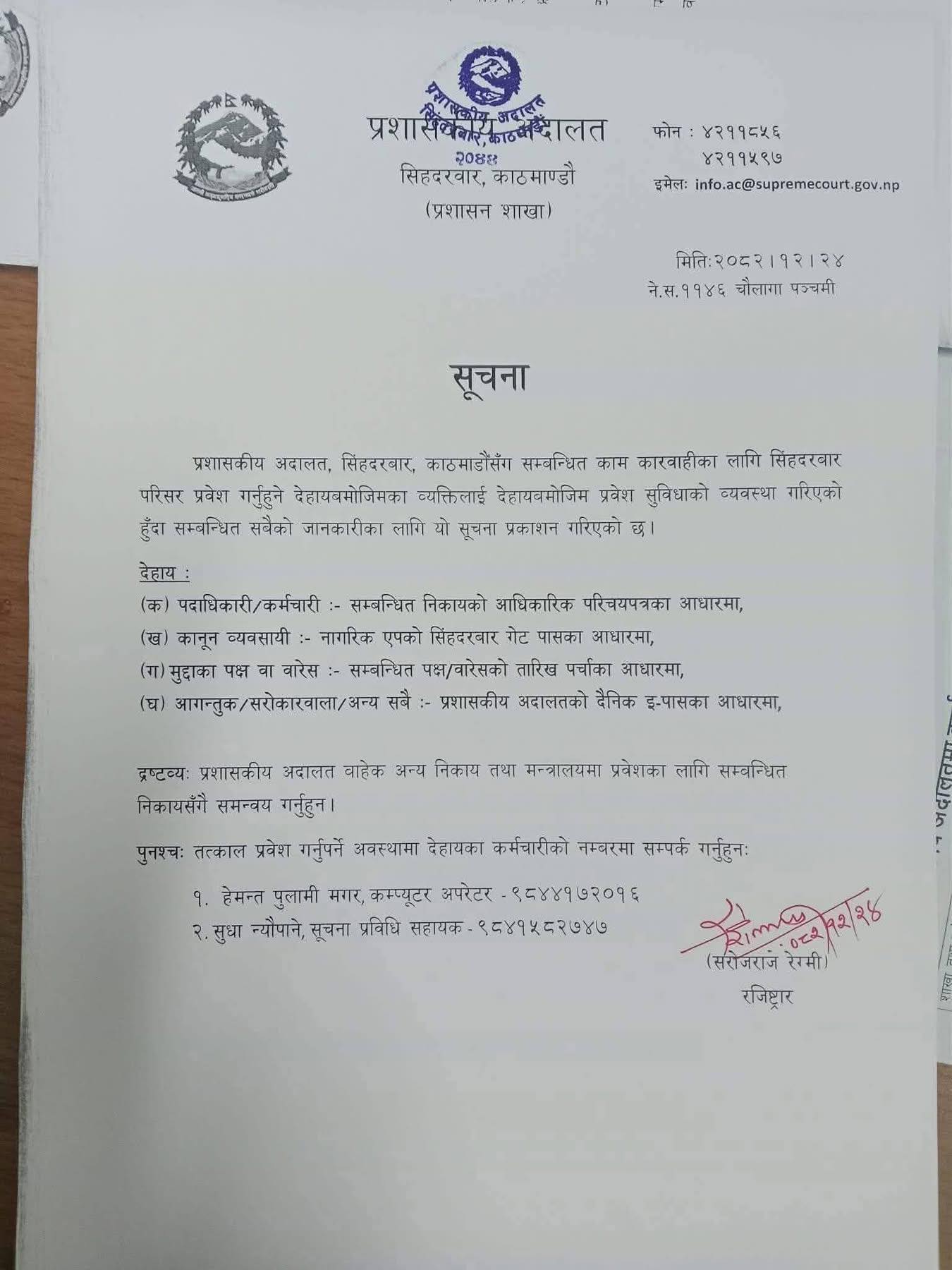अदालतका रजिष्ट्रार सरोजराज रेग्मीद्वारा जारी सूचनामा लेखिएको छ, ‘प्रशासनकीय अदालत, सिंहदरबार, काठमाडौँसँग सम्बन्धित काम कारबाहीका लागि सिंहदरबार परिसरमा प्रवेश गर्नुहुने देहायबमोजिमका व्यक्तिलाई देहायबमोजिम प्रवेश सुविधाको व्यवस्था गरिएको हुँदा सबैको जानकारीका लागि यो सूचना प्रकाशन गरिएको छ ।’