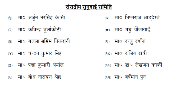 राष्ट्रिय सभा र प्रतिनिधिसभा दुबैको संयुक्त समिति मानिने संसदीय सुनुवाई समितिका सदस्यहरुमा अर्जुन नरसिंह के.सी., भिष्मराज आङ्देम्बे, कबिन्द्र बुर्लाकोटी, मधु चौलागाई, गजला समिम निकरानी, रन्जु दर्शना, चन्दन कुमार सिंह, राजिव खत्री, पद्मा कुमारी अर्याल, डा. लेखजंग कार्की, बोध नारायण श्रेष्ठ र वर्षमान पुन रहेका छन् ।