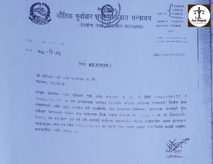 पत्रको विषय : IEE सम्बन्धमा र त्यो पत्र श्री पाथीभरा देवी दर्शन केवलकार प्रा.लि. नक्शाल काठमाडौँलाई लेखिएको छ । पत्रको विवरण यस्तो छ–