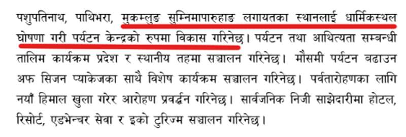 यसमा ‘पाथीभरा, मुकुम्लुङ सुम्निमा पारुहाङ लगायतका स्थानलाई धार्मिकस्थल घोषणा गरी पर्यटन केन्द्रका रुपमा विकास गरिने छ’ भनिएको छ । पाथीभराको पर्यटन विकास गर्न त स्वागत योग्य हो । तर, पाथीभरा केवलकार परियोजनाप्रति ओली सरकारकै दृष्टिकोण हो भने यो ओली र बालेन सरकारमा कुनै तात्विक भिन्नता हुने छैन । पाथीभरा र मुकुम्लुङ एकै हो ।
