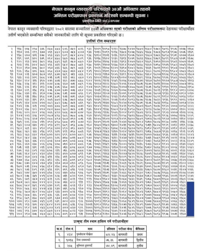 काठमाडौँ । नेपाल कानून व्यवसायी परिषद (बार काउन्सिल)ले लिएको यस वर्षको परीक्षाको नतिजा प्रकाशित भएको छ । प्रकाशित नतिजा अनुसार यस वर्ष देशमा १२७४ जना नयाँ कानून व्यवसायीहरु थपिएका छन् ।
