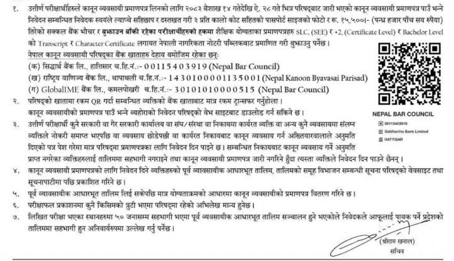 नेपाल बार काउन्सिलले बुधबार जारी गरेको सूचनामा परीक्षा उत्तीर्ण भएकाहरुले अधिवक्ताको प्रमाणपत्र लिनका लागि १५ हजार ५ सय रुपैयाँ तिर्नुपर्ने भनिएको छ ।
