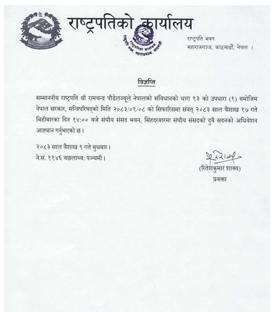 राष्ट्रपतिबाट बैशाख १७ गते संसद अधिवेशन आह्वान