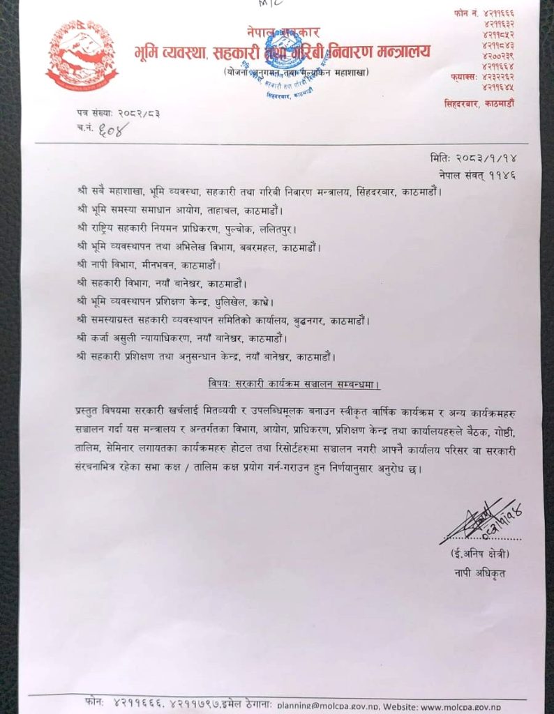 मन्त्रालयको योजना अनुगमन तथा मूल्याकंन महाशाखाले आज  सबै महाशाखा, आयोग, प्राधिकरण, विभाग  तथा कार्यालयहरूलाई परिपत्र गर्दै सरकारी खर्चलाई मितव्ययी र उपलब्धिमूलक बनाउन यस्तो निर्देशन दिएको हो ।