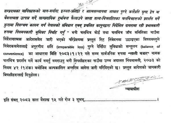 ‘सम्मानित सर्वोच्च अदालतबाट समेत मीना नेपाली विरुद्ध प्रधानमन्त्री तथा मन्त्रिपरिषद्को कार्यालय, सिंहदरबार, काठमाडौँसमेत (ने.का.प. २०७५, नि.नं.१०१५९) रहेको परमादेश रिट निवेदनमा ‘वादी समुद्रायलगायत कुनै पनि जात जाति धर्म वर्ण क्षेत्र सम्प्रदायका मानिसहरूको मान–मर्यादा इज्जत–प्रतिष्ठा र आत्मसम्मानमा आधात पुग्ने कसैप्रति घृणा द्वेष वा वैमनस्यता उत्पन्न गर्ने साम्प्रदायिक दुर्भावना फैलाउने जस्ता शब्द–चित्रसहितका चलचित्रहरूको प्रदर्शन गर्ने कुरामा नियन्त्रण कायम गर्न नेपालको संविधान एवम् प्रचलित कानूनद्वारा निर्देशित दायरामा रही प्रभावकारीरूपमा नियमनकारी भूमिका निर्वाह गर्नु भनी चलचित्र बोर्ड तथा चलचित्र जाँच समितिका नाउँमा निर्देशनात्मक आदेशसमेत जारी भएको परिप्रेक्ष्यमा प्रस्तुत रिट निवेदनमा उठाइएका विषयवस्तुले निवेदकसमेतलाई अपूरणीय क्षति (irreparable loss) पुग्ने देखिँदा सुविधाको सन्तुलन (balance of convenience) का आधारमा मिति २०८३।१।२२ गते सम्म सार्वजनिकरुपमा “लालीबजार“ नामक चलचित्र प्रदर्शन गर्ने कार्य नगर्नु नगराउनु भनी विपक्षीहरुका नाउँमा उच्च अदालत नियमावली, २०७३ को नियम ४२ (१) (क) बमोजिम अल्पकालीन अन्तरिम आदेश जारी गरिदिएको छ ।’